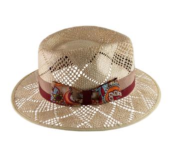 짚으로 엮은 모자로 환기성이 뛰어난 구조로 되어 있어 우수한 통풍을 제공합니다. 소재는 밝고 빛나는 외관을 제공하며, 다채로운 패턴의 반다나로 장식되어 있습니다. 물방울 모양의 크라운은 멋진 마감을 더해 스타일리시하고 독창적인 모델을 완성합니다. 동시에 태양으로부터 머리를 잘 보호해 줄 것입니다.