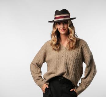 낭만주의와 보헤미안 정신이 리옹 작업실에서 제작된 이 페도라에 결합되었습니다. 텍스처와 소재의 미묘한 조화: 그로그레인 브레이드, 레이스, 헤진 리본... 각 요소는 실루엣을 풍부하게 하면서도 과하지 않게 합니다. 브림에 프린트 된 꽃무늬는 시적이고 거의 빈티지한 터치를 더합니다.