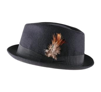 완전히 올라가는 브림이 있는 우아한 플레이어. 이 작고 매우 즐겁고 따뜻한 재즈 모자를 위한 자리를 찾아보세요. 깔끔한 브레이드 위에 놓인 깃털로 장식되어 있습니다.