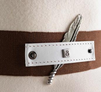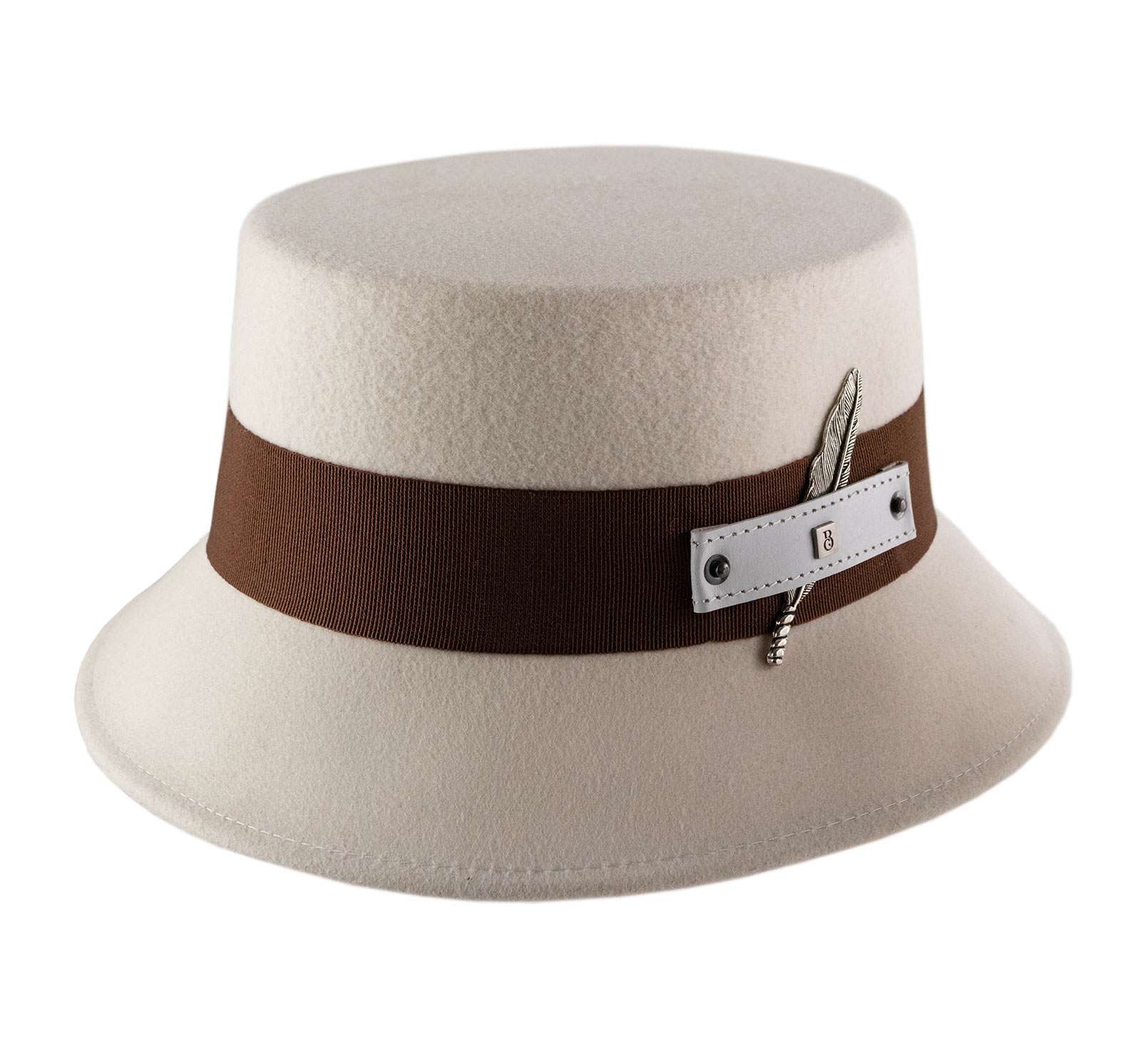 대담하고 구조적인 이 양모 펠트 버킷은 현대적인 매력으로 시선을 사로잡습니다. 넓은 그로그랭 브레이드에 깃털 모양의 금속 장식이 달린 장식이 스티치된 가죽 탭에 부착되어 있습니다.