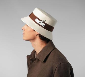 대담하고 구조적인 이 양모 펠트 버킷은 현대적인 매력으로 시선을 사로잡습니다. 넓은 그로그랭 브레이드에 깃털 모양의 금속 장식이 달린 장식이 스티치된 가죽 탭에 부착되어 있습니다.