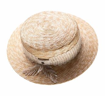 파도 모양의 라피아 리본으로 장식된 카노티에 모자. 노드에 놓인 베이지 아이보리 색상의 오래된 인조 가죽 링이 우리의 브랜드를 나타냅니다. 팔름 잎 모양의 수지 보석으로 가장자리를 장식하는 장식이 있습니다.