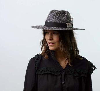 멜루진 펠트 모자(긴 털 물결진 펠트)로, 부드럽고 섬세한 펠트로 제작되었으며, 금속 브러시로 섬유를 뽑아내어 이 털 같은 효과를 주는 마감 처리가 되어 있습니다. 이 모자는 표범 무늬로 장식되어 있어 창작물에 세련된 느낌을 더합니다. 분할된 크라운은 리본과 대조되는 깃털로 마무리된 새틴 장식으로 고정되어 있습니다.
