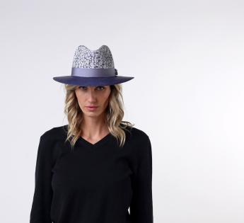 린넨과 봄 패턴으로 장식된 크라운을 가진 꽃무늬 파나마. 이 모델은 원래 염색된 밀짚으로 짜여져 있으며 앞과 뒤에서 브림이 내려가는 형태입니다. 이는 다이나믹한 형태의 트래블러로, 색조가 전체 블루 룩 트렌드에 맞춰져 있습니다.