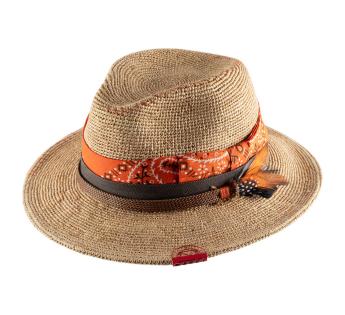 크로셰로 짠 라피아로 만든 모자. 검은 장식으로 장식되어 있어 더욱 돋보입니다. 이 모자는 트래블러로, 모험적이고 캐주얼합니다.