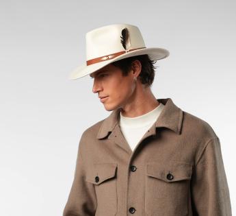 약간 위로 올라간 옆 가장자리와 확고한 실루엣을 가진 이 모자는 현대적인 터치로 카우보이 스타일을 재해석합니다. 부드러운 선으로 조각된 크라운은 자수로 장식된 가죽 브레이드와 탈부착 가능한 천연 깃털로 보완됩니다.