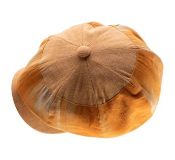 넓은 체크무늬의 주황색 캡 모자. 타이 다이 스타일의 구성이 독특한 매력을 더합니다.