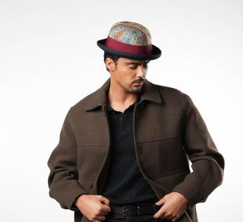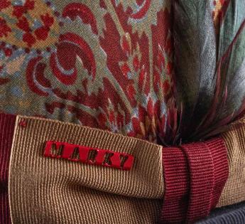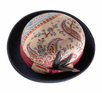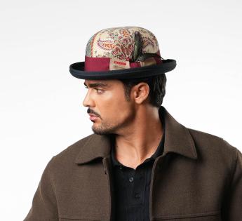 한정판으로 출시된 이 볼러는 빈티지 페이즐리 패브릭으로 덮여 있어 독특한 매력을 자아냅니다. 각 제품은 다른 패턴 배치를 특징으로 하여 각 모자가 진정으로 독특합니다. 정교하게 제작된 장식은 이중 색상의 브레이드와 녹색 및 버건디 색조의 수탉 깃털로 강화되어 대담하고 세련된 실루엣을 완성합니다.