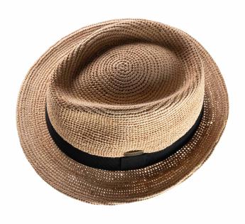크로셰로 엮은 라피아로 제작된 여름 모자. 모자는 검은 장식으로 장식되어 있습니다.