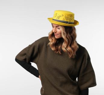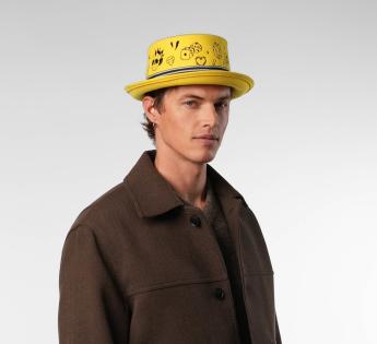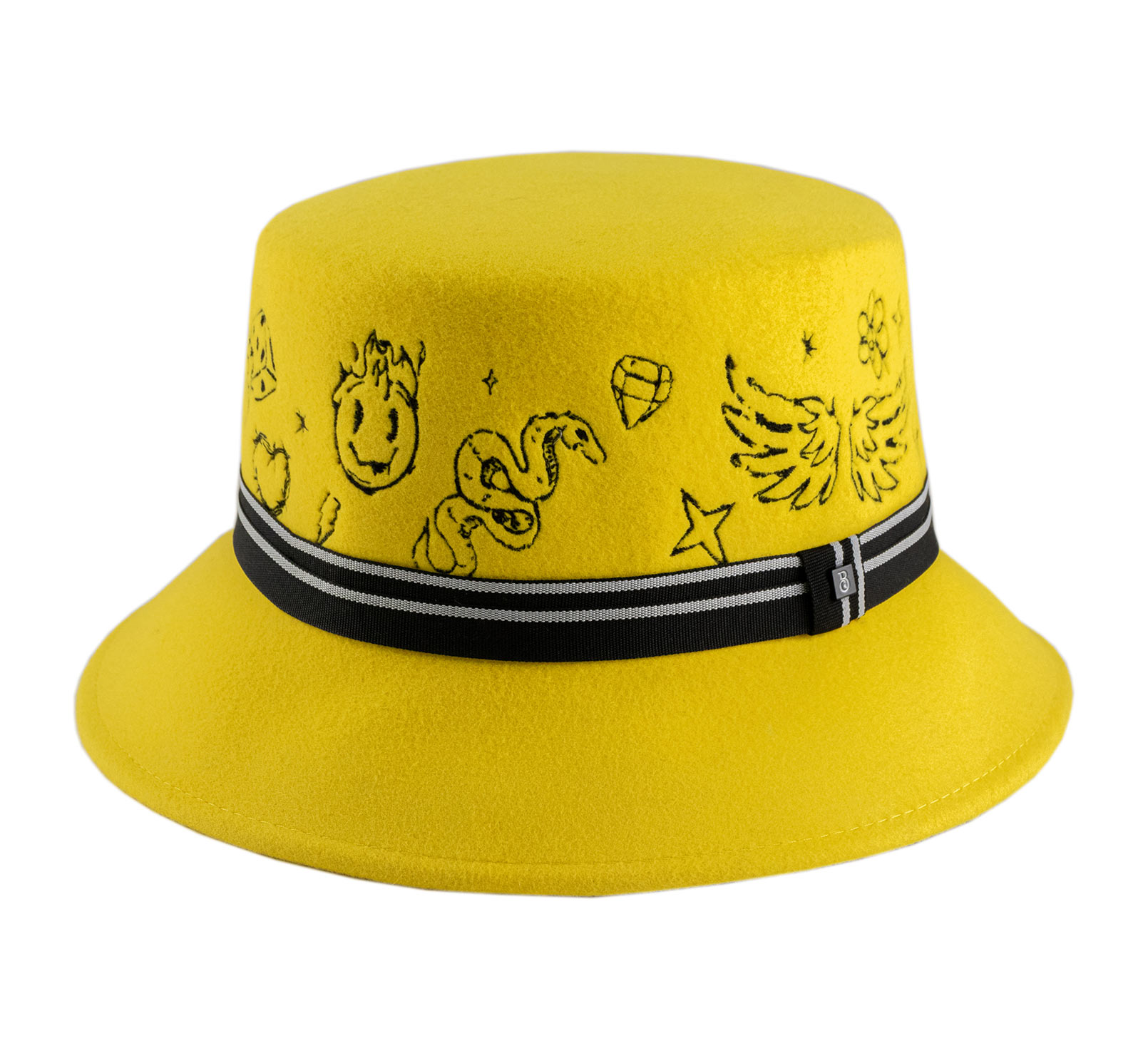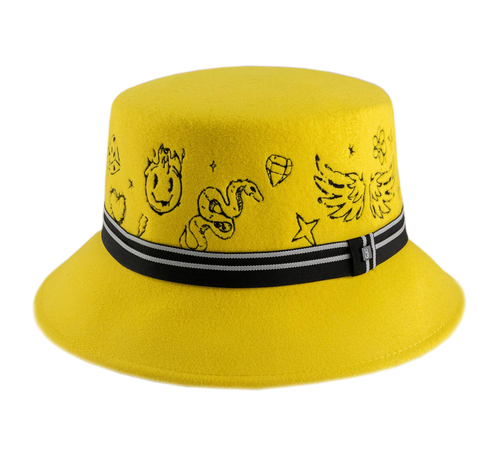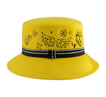 컬러풀하고 대담하며 울트라 크리에이티브한 이 양모 펠트 버킷은 모자의 코드를 재창조합니다. 평평한 크라운은 그래픽 타투 스타일의 패턴으로 완전히 자수되어 스트리트하고 독특한 매력을 더합니다. 줄무늬 브레이드는 전체를 구조화하며 중앙의 금속 인증 로고로 강조됩니다. 이 모델은 모든 시선을 사로잡으며 진정한 스타일의 자유를 주장합니다.