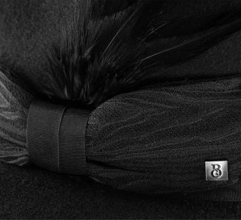톤온톤의 브레이드로 장식된 세련된 펠트 모자, 아름다운 대리석 효과가 있으며, 모든 것이 섬세합니다. 전체는 완전한 검은색 깃털 조합으로 강조됩니다.
