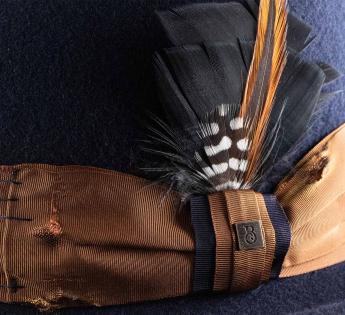 새틴 브레이드는 신중하게 불에 태우고, 올을 풀고, 긁어내어 독특한 마모 효과를 만들어내며, 매듭을 유지하기 위해 자수로 강화되었습니다. 자연 깃털이 우아함과 무심함 사이의 대조를 강조합니다. 크라운에는 개방형 자수 컷아웃이 전체에 깊이와 독창성을 더합니다.