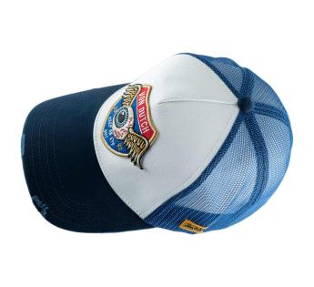 첫눈에 이 캡 모자는 자신만의 개성을 드러냅니다. 상징적인 엠블럼, 트러커 실루엣, 그리고 블루와 화이트의 대조가 대담하고 입체적인 빈티지 무드를 완성합니다.